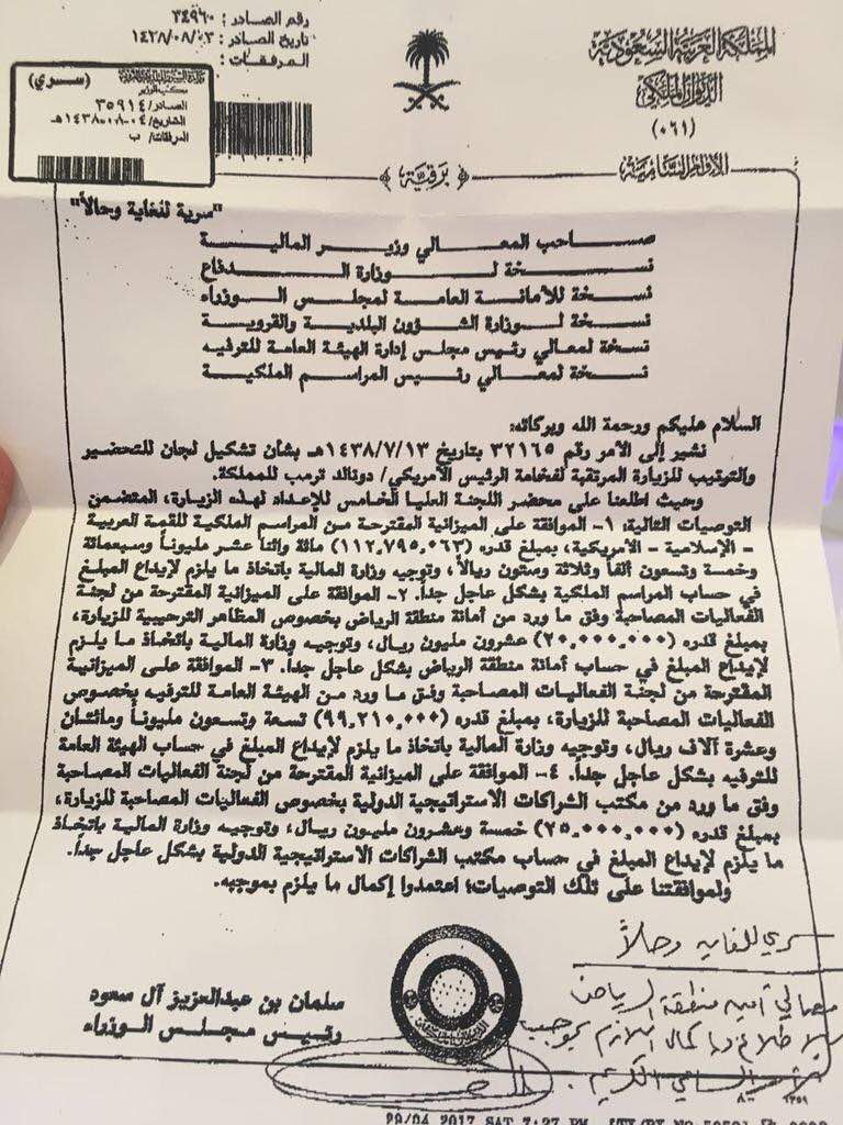به گزارش پایگاه خبری دیده بان شیعه به نقل از پایگاه شبکه ماهواره ای المنار، این سند نشان می دهد که دربار پادشاهی عربستان، هزینه کردن بیش از ۶۸ میلیون دلار آمریکایی معادل ۲۵۶ میلیون ریال سعودی را برای مراسم استقبال از دونالد ترامپ در نظر گرفته است که این هزینه ها شامل مراسم نشست سران عربی اسلامی و آمریکا، مراسم استقبال از ترامپ و هزینه های رفاهی مربوط به این سفر می شود.